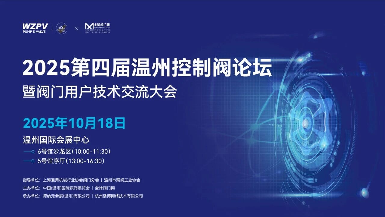 2025第四届温州控制阀论坛暨阀门用户技术交流大会作为2025年第四届中国(温州)国际泵阀展览会的重要配套活动,定于10月18日在温州国际会展中心举办。本次活动核心目的在于汇聚行业力量,共同探讨和推动控制阀领域的技术进步与产业发展。活动聚集控制阀领域的专家学者、企…